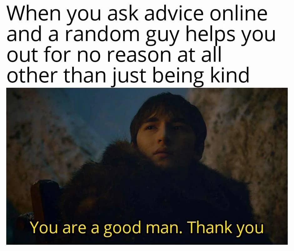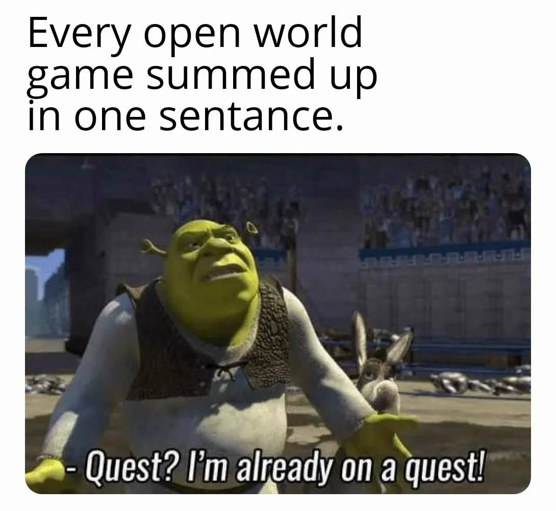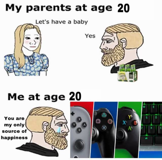 My parents at age 20 / Let's have a baby / Yes / Me at age 20 / You are my only source of happiness When ur squad can't agree on a date and u start attending your own plans because summer doesn't last forever Every open world game summed up in one sentance. / Quest? I'm already on a quest! Q-tips maker: Do not insert into ear canal! / literally everyone When you're just starting out in the game but they let you keep the legendary weapon from the tutorial When you have used all your lego parts but now want to build a new sick spaceship / One must destroy in order to create When you ask advice online and a random guy helps you out for no reason at all other than just being kind / You are a good man. Thank you When the barber asks how my haircut is before giving me my glasses back