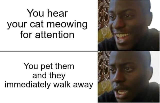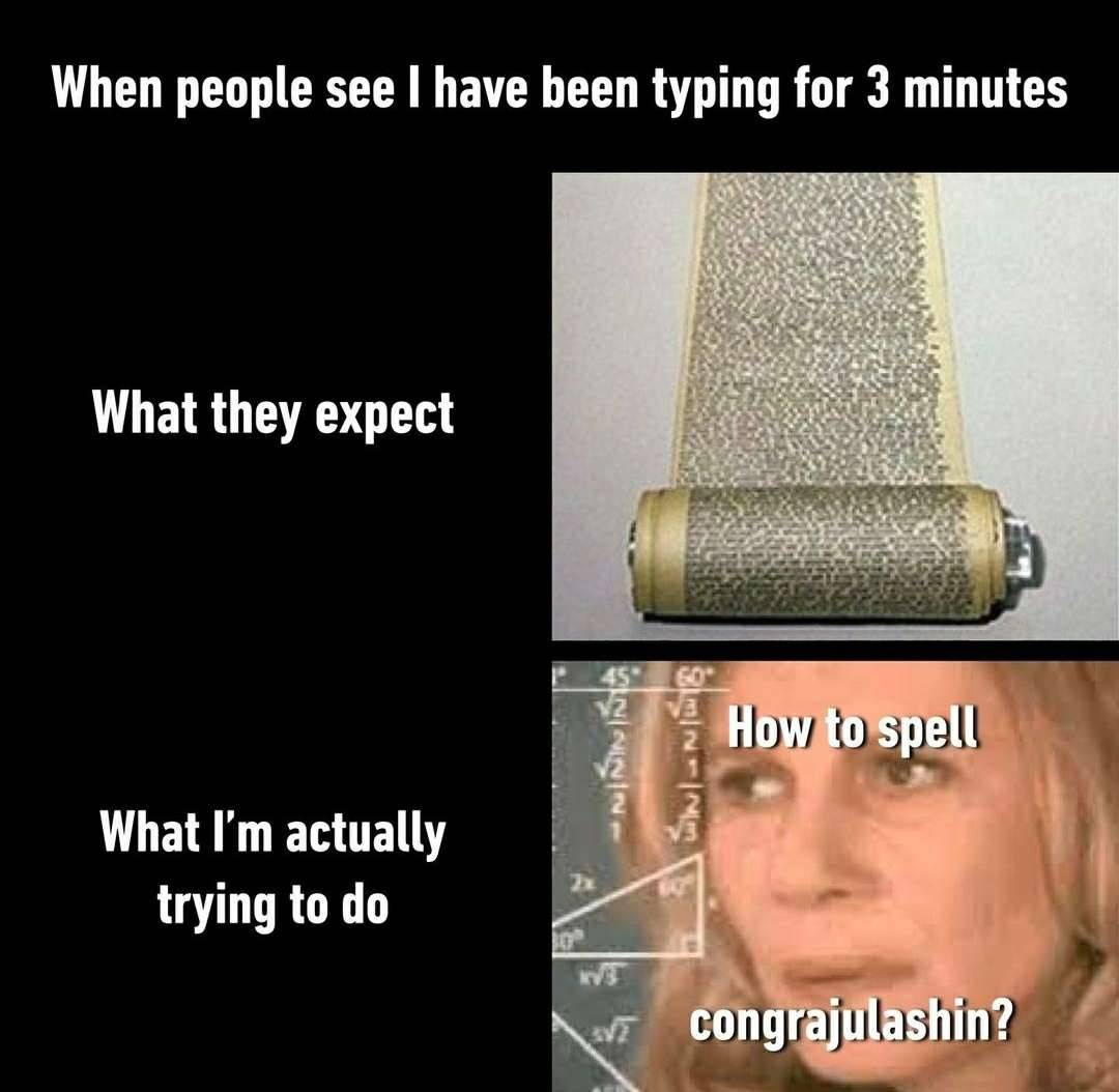 You hear your cat meowing for attention / You pet them and they immediately walk away "Where have you been? i haven't seen you in ages" When you're trying to watch the movie and the subtitles at the same time When your leg hurts so you stab your other one and pain is equally distributed When your favorite phone charger starts only charging at certain angles / No. no, stay with me! / Don't leave me!! When your a little too eager opening the oven and you get boiling hot air blown in your face When you mess up the poached egg When people see i have been typing for 3 minutes / What they expect / What i'm actually trying to do / How to spell congrajulashin?