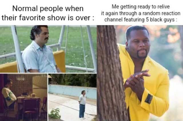 Normal people when their favorite show is over / Me getting ready to relive it again through a random reaction channel featuring 5 black guys