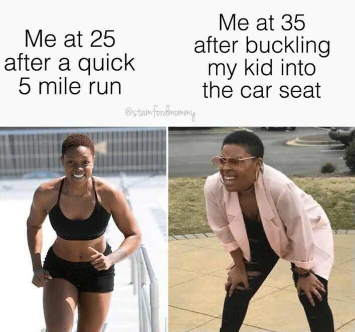Me at 25 after a quick 5 mile run / Me at 35 after buckling my kid into the car seat