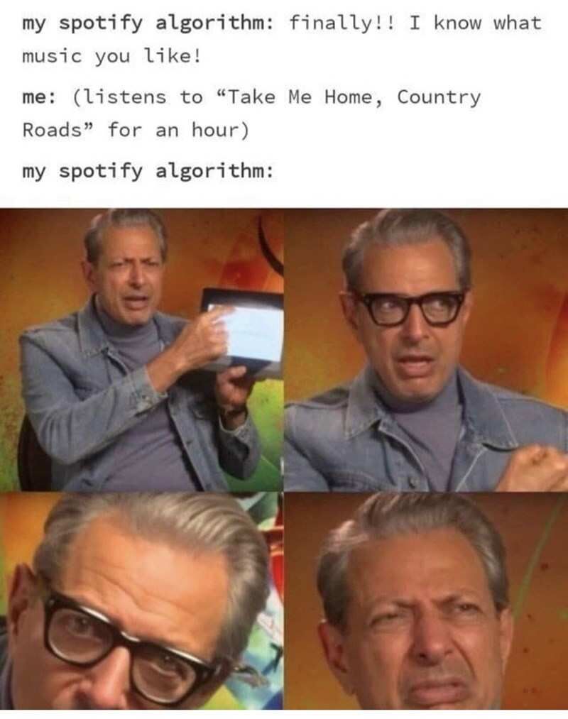 my spotify algorithm: finally!! I know what music you like! / me: (listens to "Take Me Home, Country Roads" for an hour) / my spotify algorithm