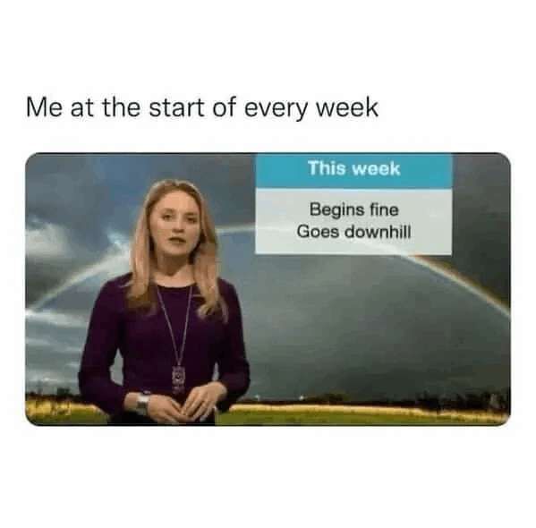 Me at the start of every week: This week / Begins fine Goes downhill