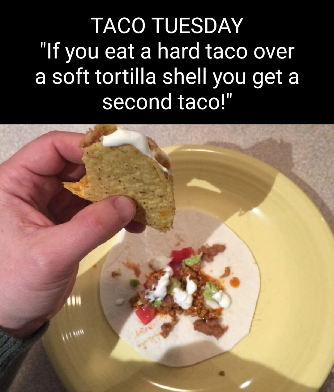 TACO TUESDAY "If you eat a hard taco over a soft tortilla shell you get a second taco!"