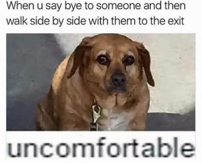When u say bye to someone and then walk side by side with them to the exit: uncomfortable