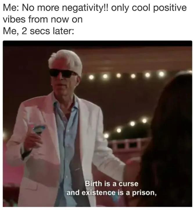 Me: No more negativity!! only cool positive vibes from now on / Me, 2 secs later: Birth is a curse and existence is a prison,
