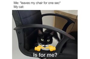 “Is for me?”Cat takes over chair meme captures classic pet humor