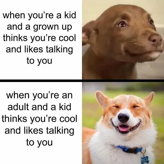 when you're a kid and a grown up thinks you're cool and likes talking to you / when you're an adult and a kid thinks you're cool and likes talking to you
