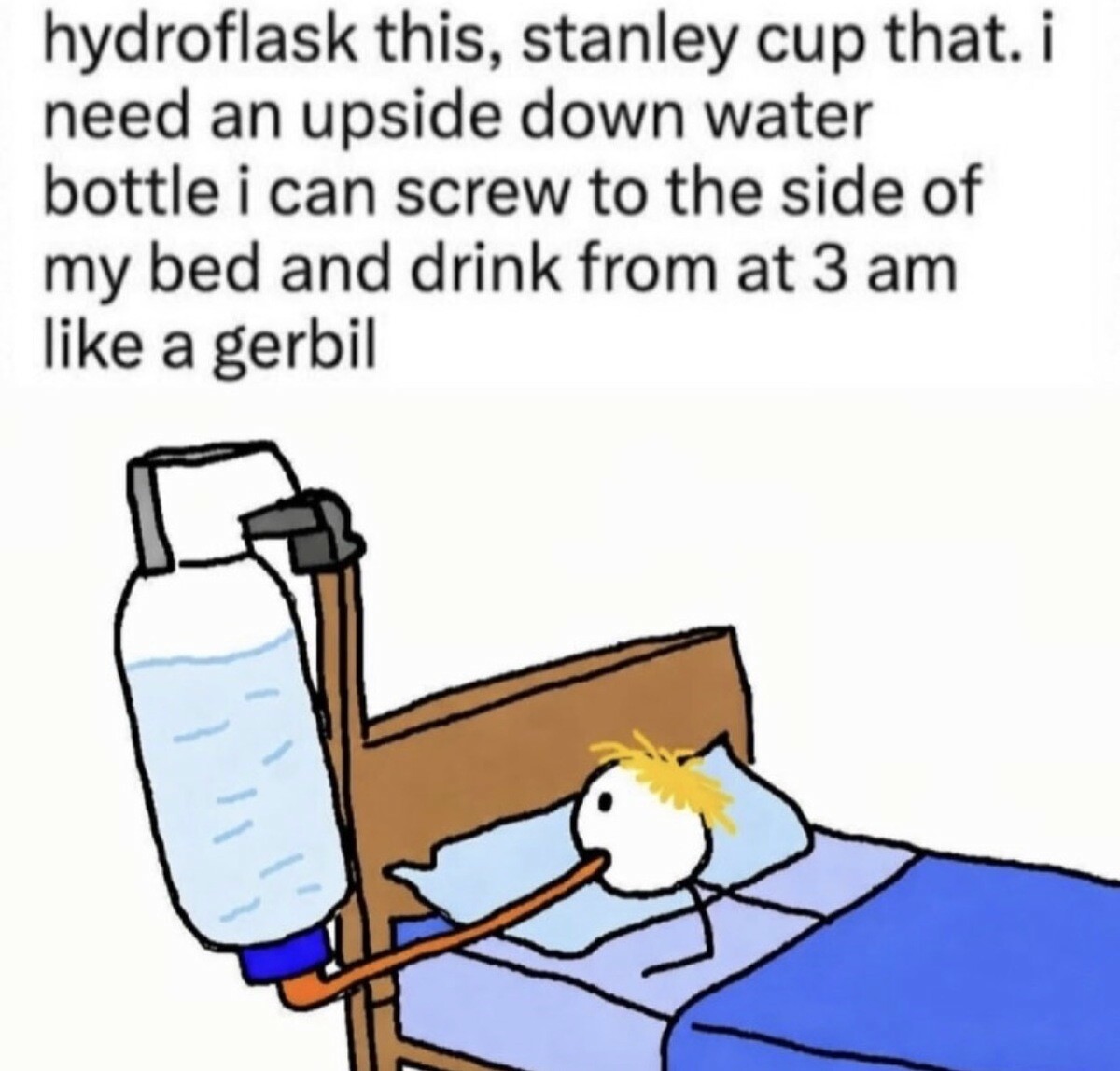 Hydroflask this, stanley cup that. I need an upside down water bottle i can screw to the side of my bed and drink from at 3 am like a gerbil