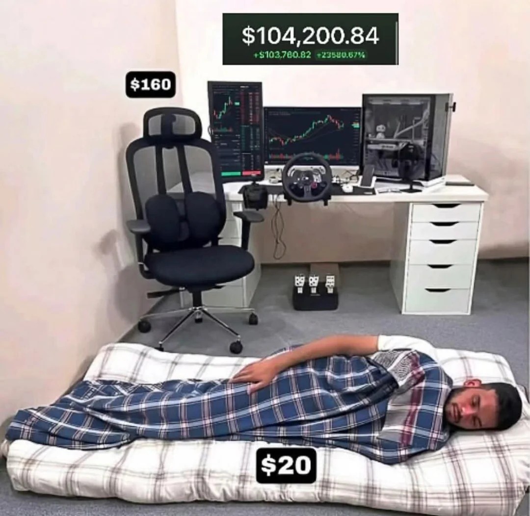 Man sleeping on floor with $20 mattress / $160 chair / $104,200.84 profit display