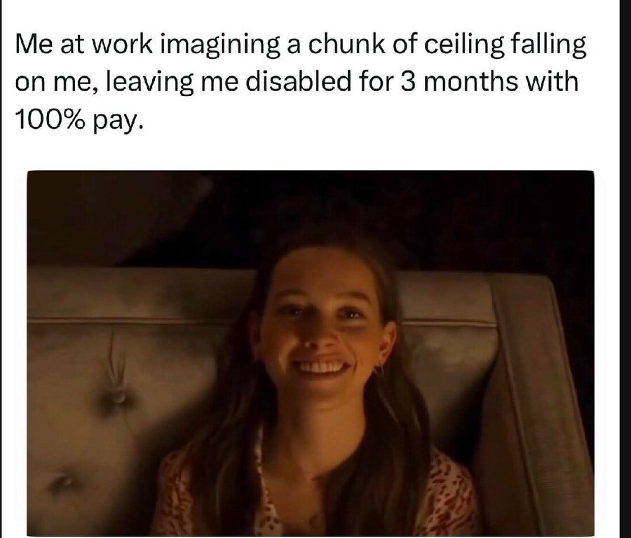 Me at work imagining a chunk of ceiling falling on me, leaving me disabled for 3 months with 100% pay.