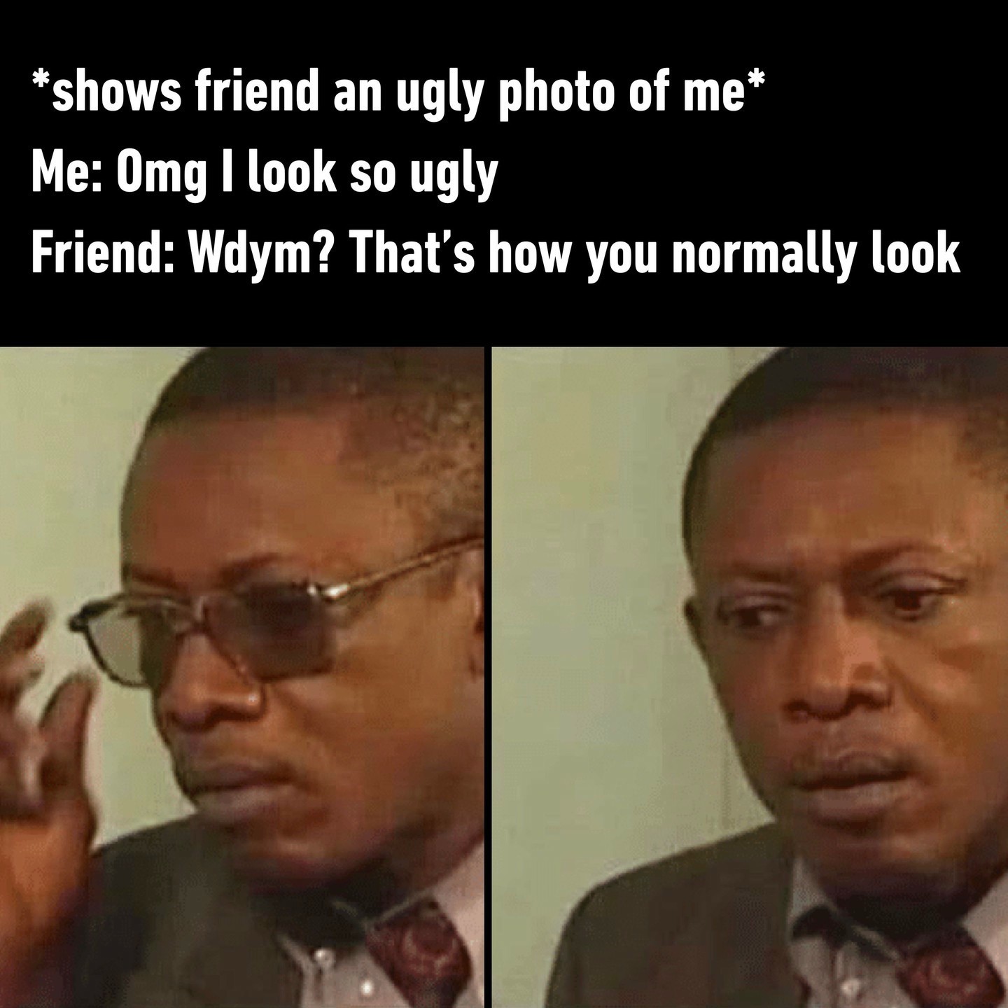 shows friend an ugly photo of me / Me: Omg i look so ugly / Friend: Wdym? That’s how you normally look
