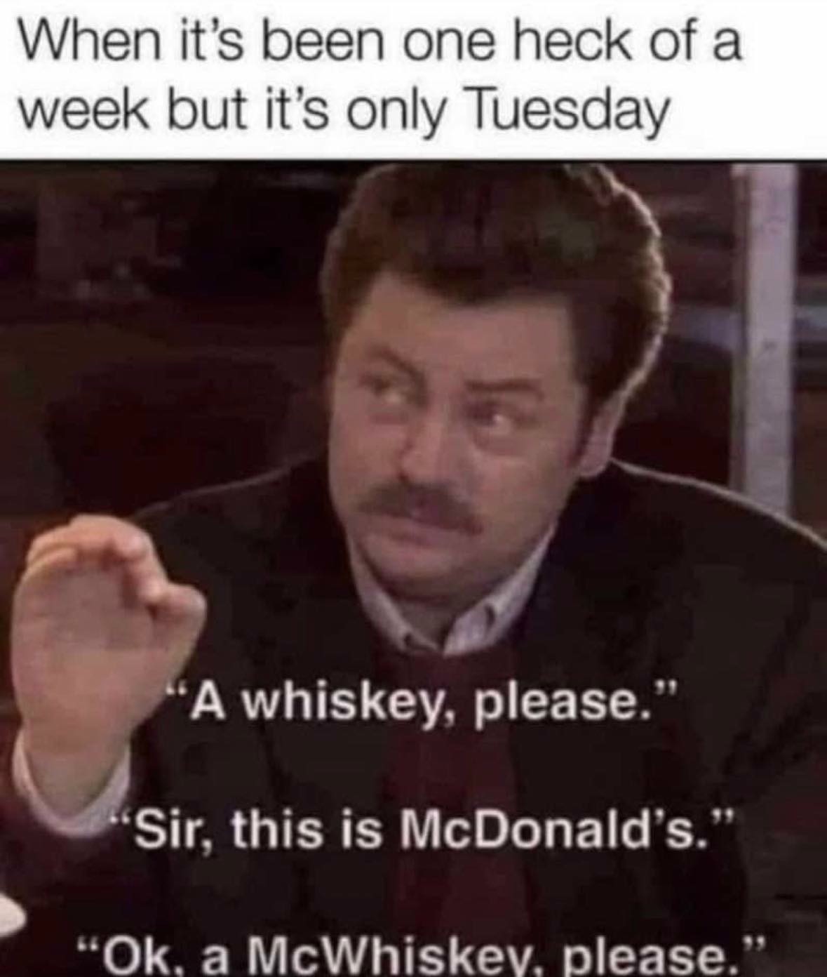 When it's been one heck of a week but it's only Tuesday / "A whiskey, please." / "Sir, this is McDonald's." / "Ok, a McWhiskey, please."