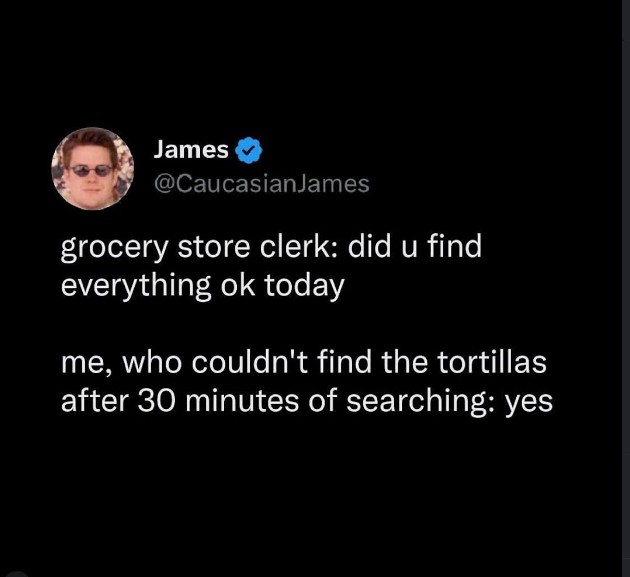 Grocery store clerk: did u find everything ok today / Me, who couldn't find the tortillas after 30 minutes of searching: yes