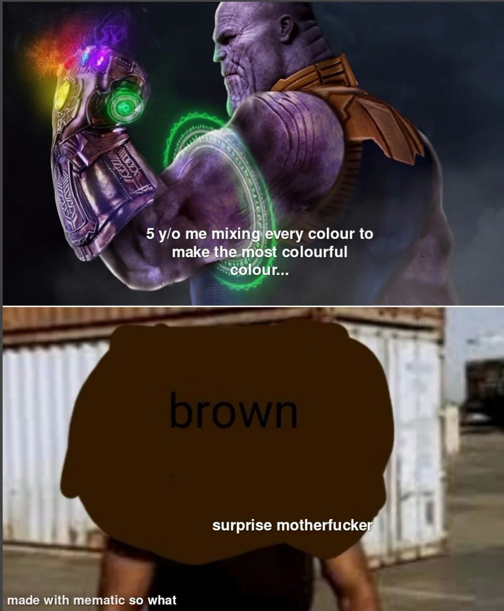 5 y/o me mixing every colour to make the most colourful colour / brown / surprise motherfucker / made with mematic so what