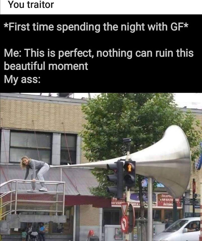 You traitor / *First time spending the night with gf* / Me: this is perfect, nothing can ruin this beautiful moment / My ass