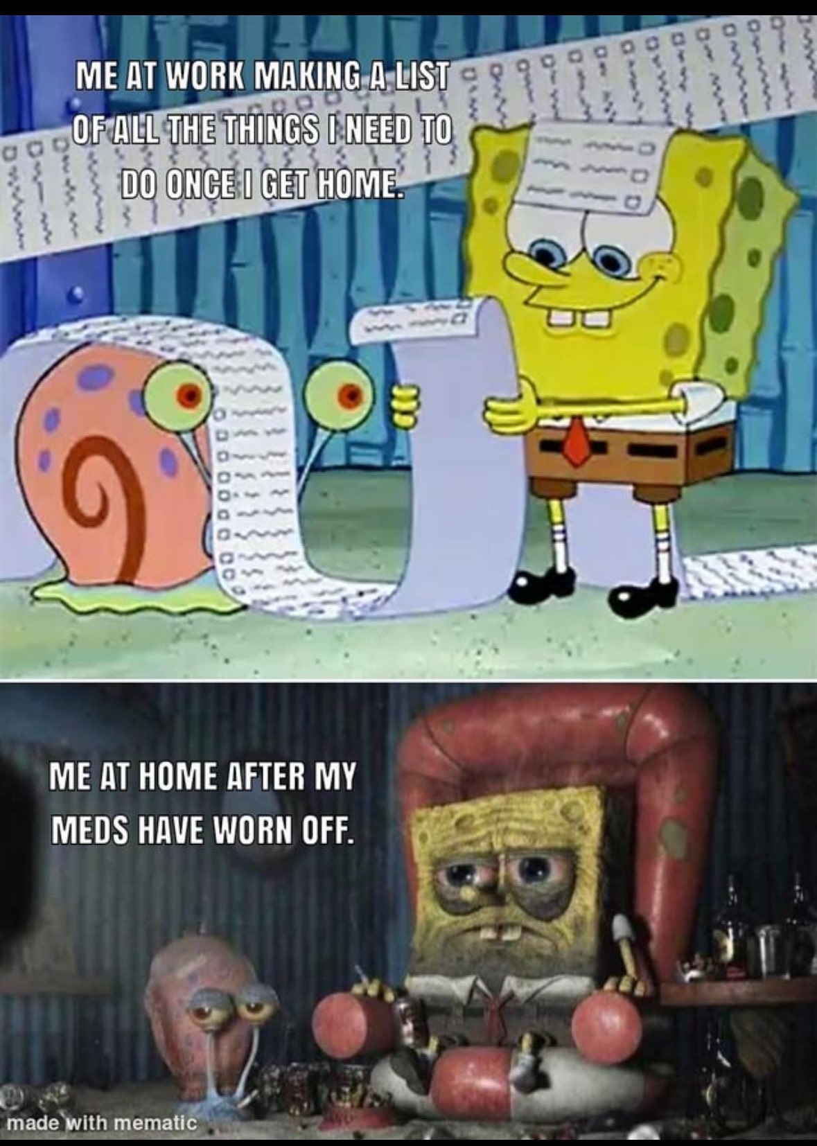 Me at work making a list of all the things i need to do once i get home / Me at home after my meds have worn off