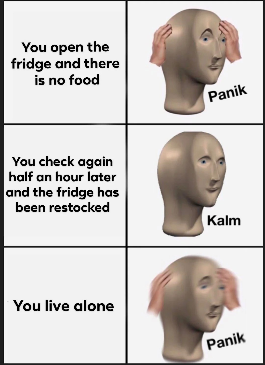 you open the fridge and there is no food / you check again half an hour later and the fridge has been restocked / you live alone / Panik kalm