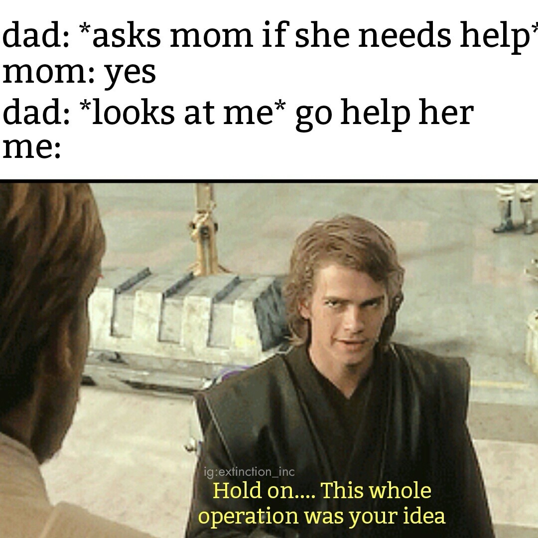 Dad: *asks mom if she needs help* / Mom: yes / Dad: *looks at me* go help her / Me: hold on.... this whole operation was your idea