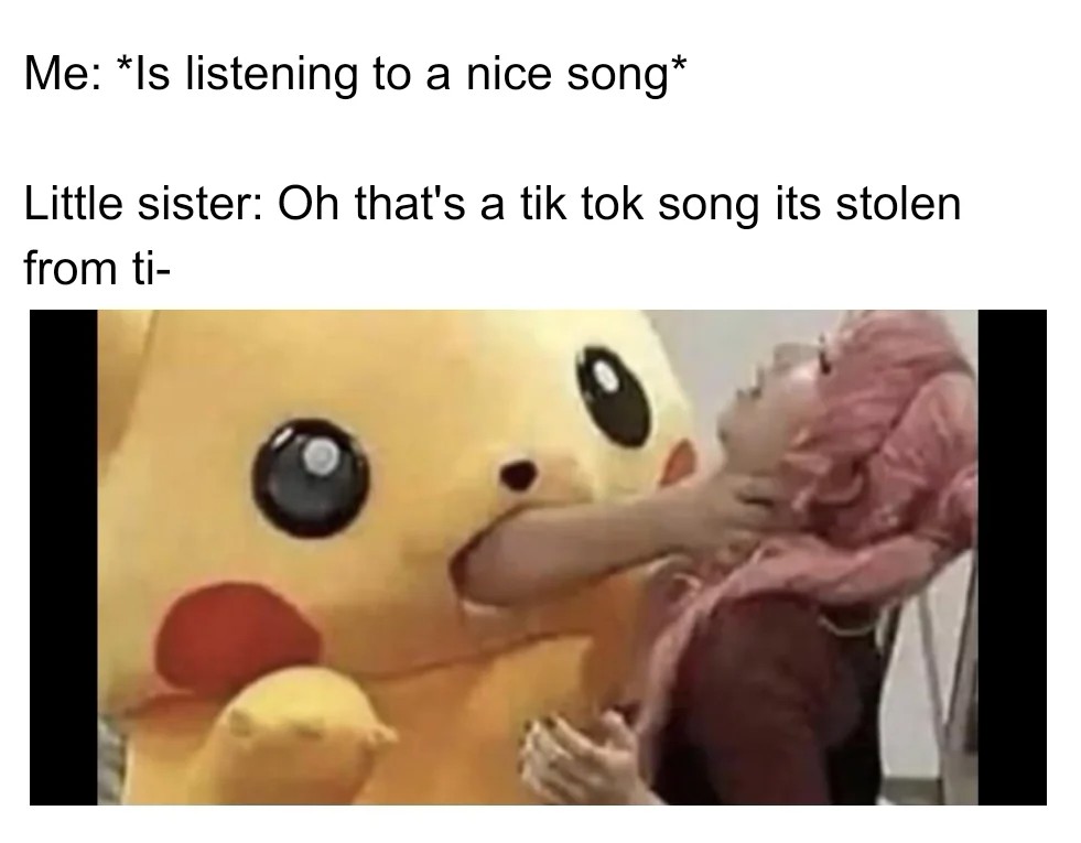 me: *is listening to a nice song* / little sister: oh that's a tik tok song its stolen from ti-