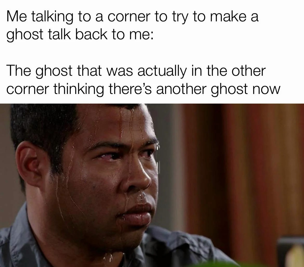 me talking to a corner to try to make a ghost talk back to me: / the ghost that was actually in the other corner thinking there's another ghost now