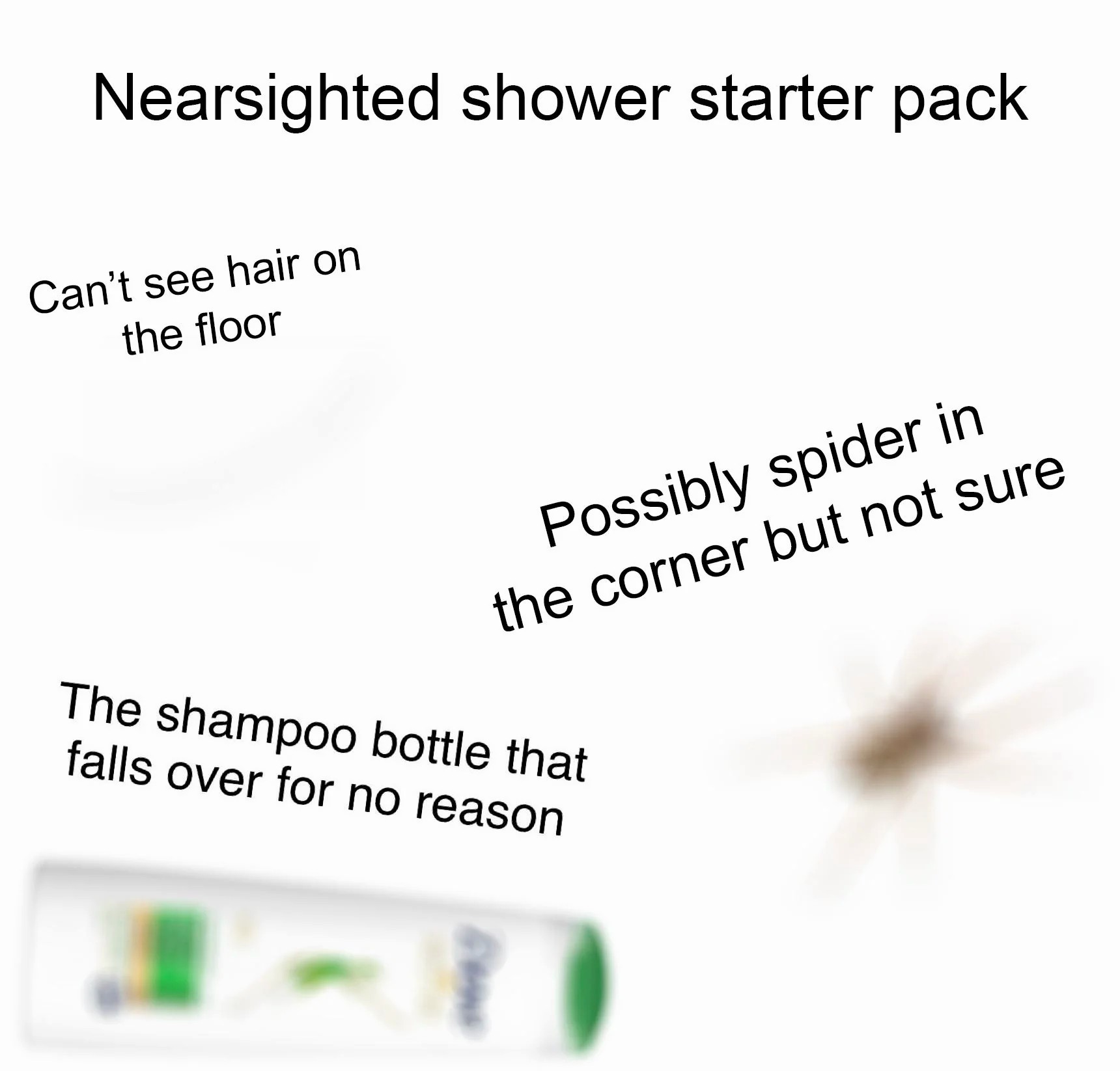 nearsighted shower starter pack / can't see hair on the floor / possibly spider in the corner but not sure / the shampoo bottle that falls over for no reason
