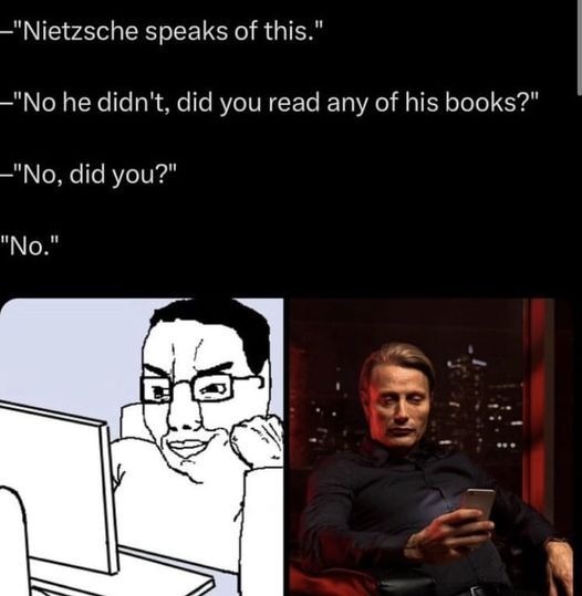 "nietzsche speaks of this." / "no he didn't, did you read any of his books?" / "no, did you?" / "no."