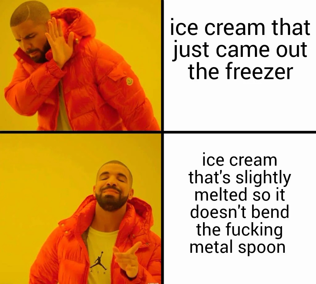 ice cream that just came out the freezer / ice cream that's slightly melted so it doesn't bend the fucking metal spoon