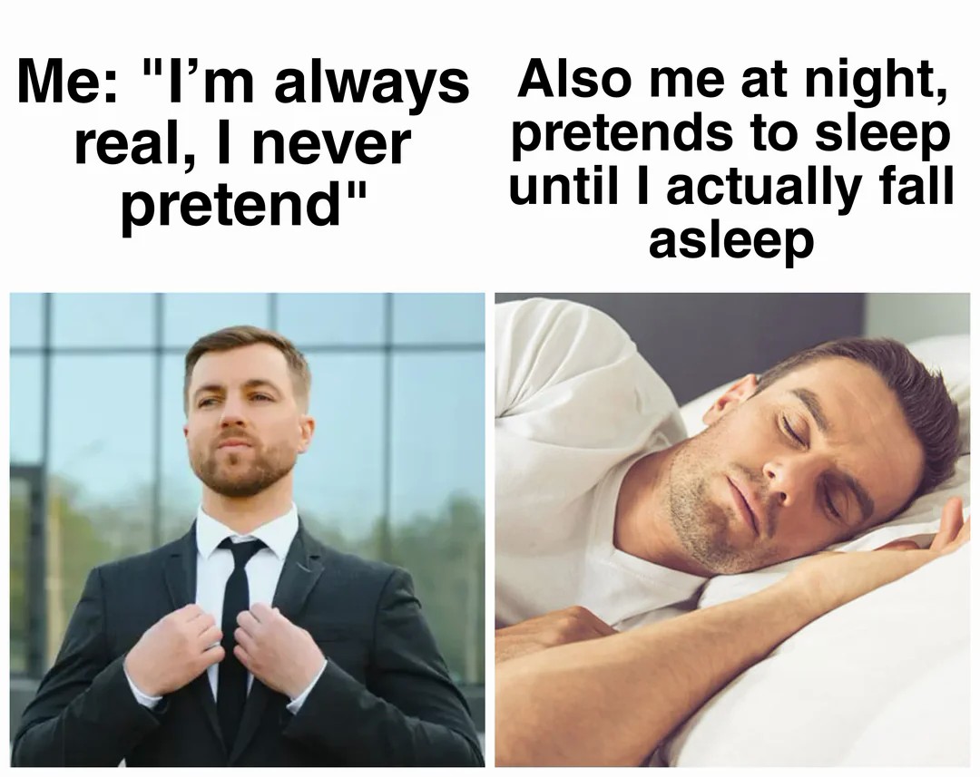 me: "i'm always real, i never pretend" / also me at night, pretends to sleep until i actually fall asleep