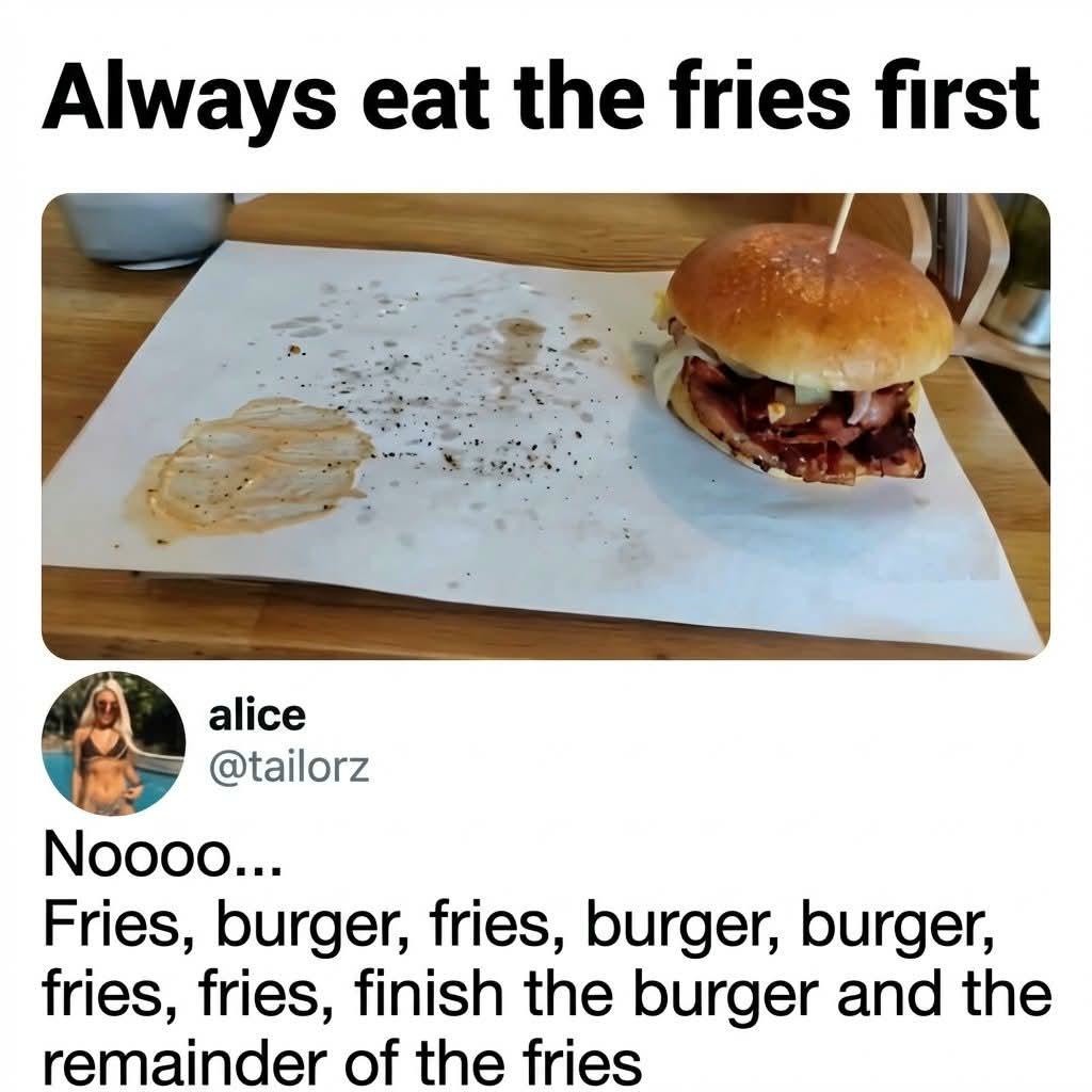 Always eat the fries first / Noooo... fries, burger, fries, burger, burger, fries, fries, finish the burger and the remainder of the fries