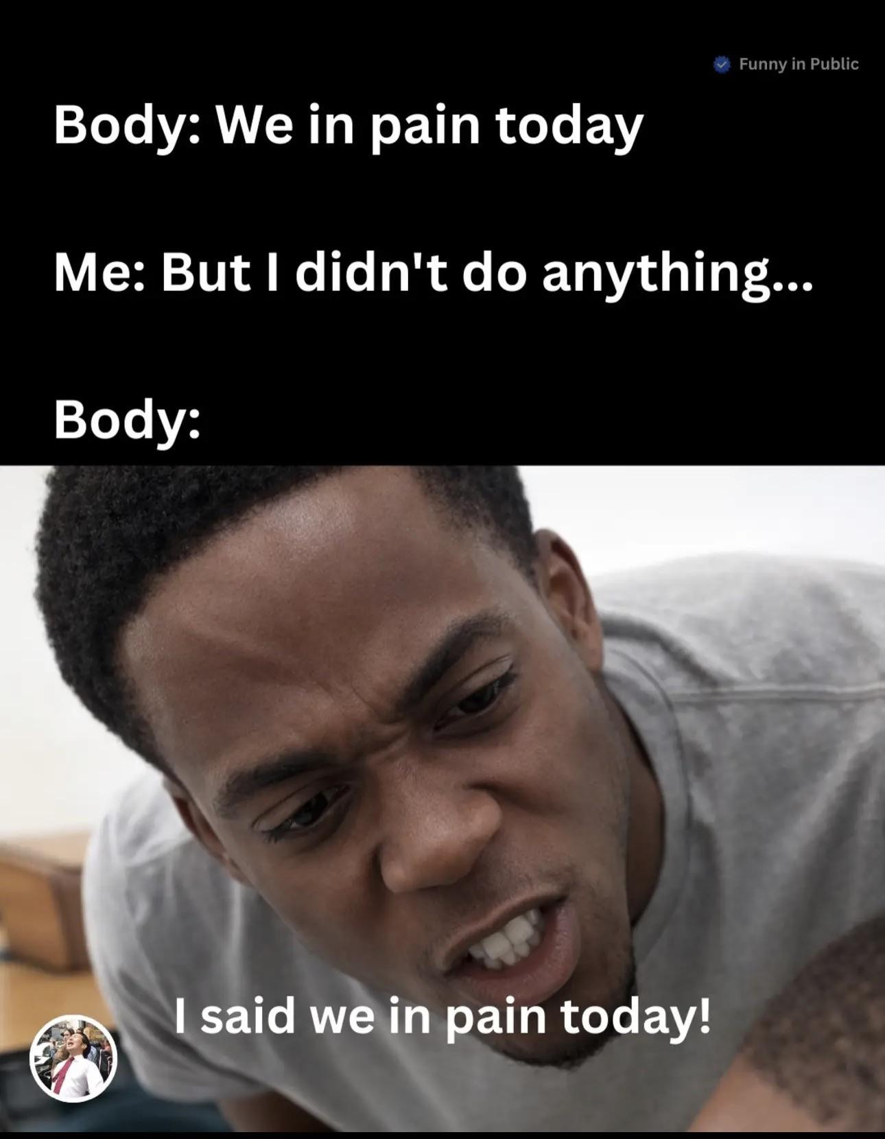 Body: we in pain today / Me: but i didn't do anything... / Body: i said we in pain today