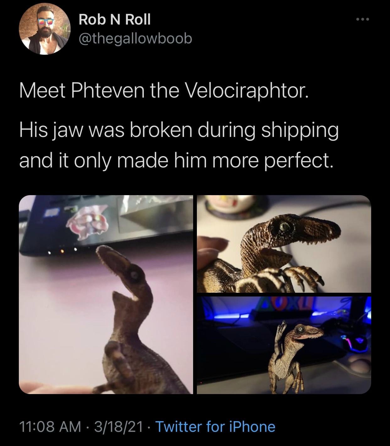 Meet phteven the velociraphtor. / his jaw was broken during shipping and it only made him more perfect.
