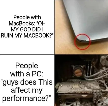 People with macbooks: "oh my god did i ruin my macbook?" / people with a pc: "guys does this affect my performance?"